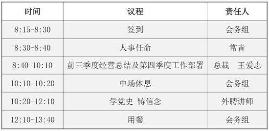 2. 各項(xiàng)目部及職能部門請(qǐng)于會(huì)后一周內(nèi)召開內(nèi)部專題會(huì),及時(shí)傳達(dá)本次經(jīng)營會(huì)會(huì)議精神,落實(shí)第四季度重點(diǎn)工作。