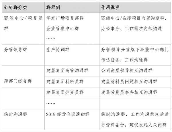 請(qǐng)公司各位負(fù)責(zé)人及同事于 2019 年 2 月 28 日前,關(guān)閉相關(guān)的 QQ 和微信工作群,在釘釘建立工作溝通群,逾期未進(jìn)行該項(xiàng)工作的人員將予以警告。原則上只允許存在一個(gè)中心職能部門群或項(xiàng)目部管理群;建立跨部門臨時(shí)群時(shí),需按照誰(shuí)主導(dǎo)誰(shuí)發(fā)起的原則進(jìn)行建立臨時(shí)溝通群,事務(wù)溝通結(jié)束后,建議將相關(guān)文件資料進(jìn)行備份后解散關(guān)閉釘釘群;若是建立跨部門永久綜合溝通群,則以主管領(lǐng)導(dǎo)的身份進(jìn)行建立釘釘群,并制定好群規(guī),保證工作的有效溝通和效率。