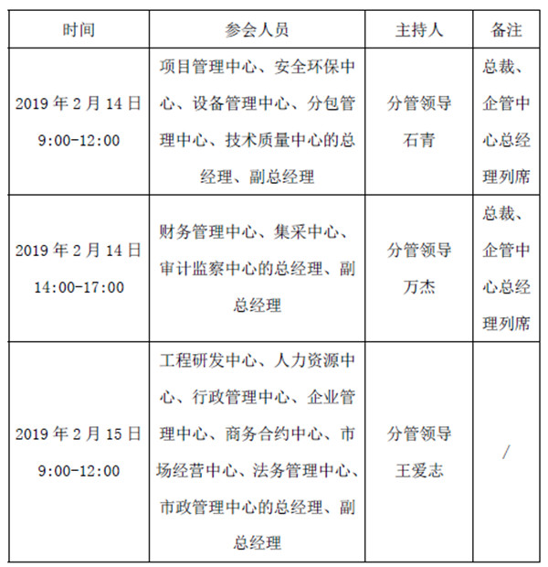 三、【時(shí)間】:2019 年 2 月 14 日-15 日,具體安排見(jiàn)“具體安排” 。四、【地點(diǎn)】:集團(tuán)總部二樓會(huì)議室