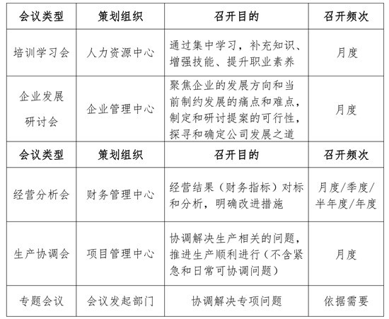 為穩(wěn)步提升公司經(jīng)營管理水平,及時解決公司經(jīng)營管理過程中的各項問題,保障各項工作及時有效落實(shí),確保公司年度經(jīng)營目標(biāo)和戰(zhàn)略目標(biāo)的實(shí)現(xiàn),經(jīng)公司研究決定,2021 年針對公司級的經(jīng)營管理會議召開做進(jìn)一步完善,具體安排如下: