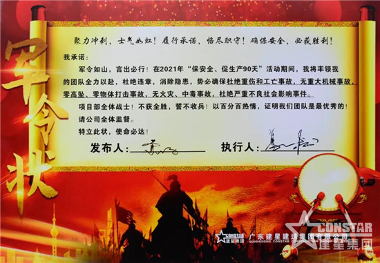 安全至上,誓言如磐。集團副總裁黃鵬帶領各項目經理及相關安全負責人鄭重宣誓、簽訂軍令狀和目標責任書,進一步夯實全員安全生產責任,讓安全意識真正根植到每一位員工心中,使安全理念內化于心、外化于行、固化于制,確保項目安全生產。