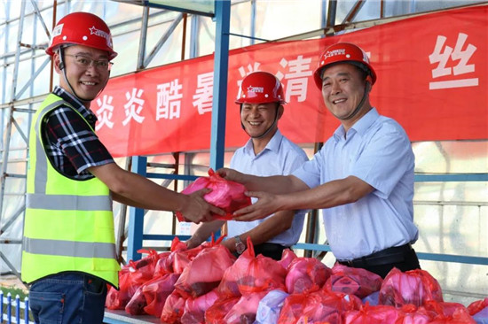 華東區(qū)域總經理王新志(右一)、安環(huán)管理中心總經理郭定春(中)送清涼物資