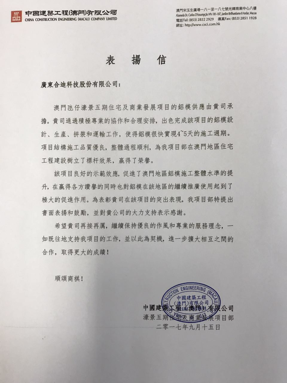 集團(tuán)下屬公司合迪科技鋁合金模板又獲贊譽(yù)