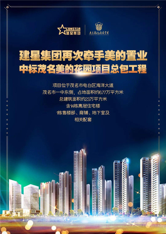 近日,建星集團(tuán)成功中標(biāo)茂名美的花園項(xiàng)目一期總包工程。這是繼佛山美的鷺明花園項(xiàng)目之后,建星與美的置業(yè)的再次深入合作。