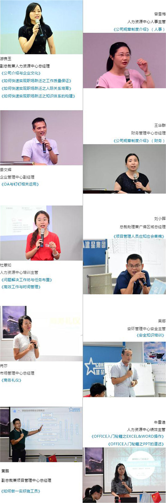 本次培訓(xùn)邀請到了強(qiáng)大的內(nèi)訓(xùn)講師團(tuán),他們或親切睿智、或幽默風(fēng)趣、或嚴(yán)謹(jǐn)細(xì)膩。講師們結(jié)合自己的職場經(jīng)驗(yàn),為星青年們傳遞建星企業(yè)文化、分享在建星成長路上的所思所想,讓星青年們迅速地了解建星、融入建星、愛上建星。