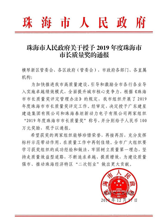喜訊|繼省政府質(zhì)量獎后,建星集團再攬珠海市長質(zhì)量獎