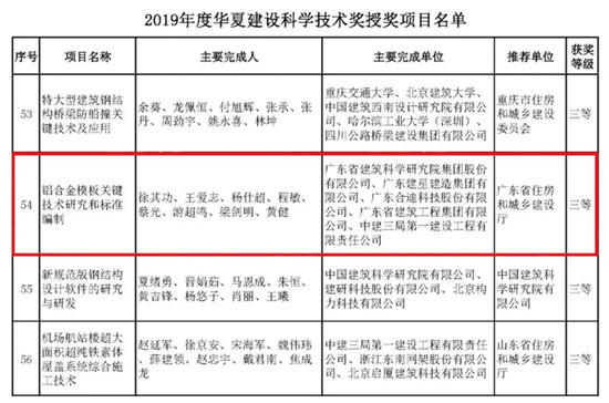 近日,華夏建設(shè)科學(xué)技術(shù)獎(jiǎng)勵(lì)委員會(huì)公布“2019年度華夏建設(shè)科學(xué)技術(shù)獎(jiǎng)“獲獎(jiǎng)名單,建星集團(tuán)參與完成的科研項(xiàng)目《鋁合金模板關(guān)鍵技術(shù)研究和標(biāo)準(zhǔn)編制》獲2019年度華夏建設(shè)科學(xué)技術(shù)獎(jiǎng)三等獎(jiǎng)。
